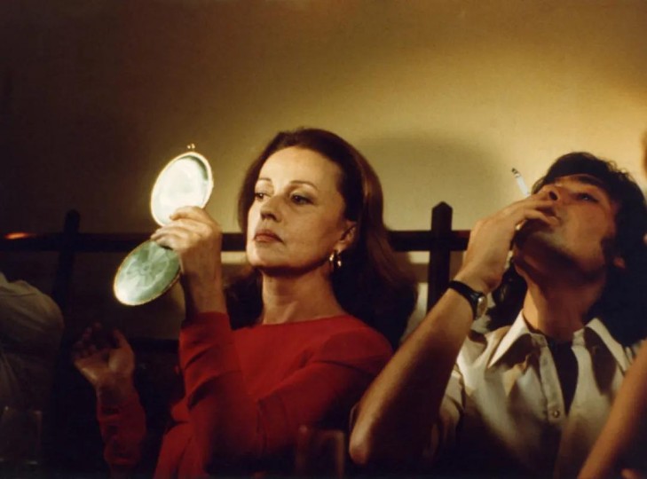 “整个自然生命的进程,皆是一种氧化过程。”(La vie de la nature tout entière est un processus d’oxydation)这句出自“蓝花诗人”诺瓦利斯(Novalis)的断言,仿佛也可以归于盖·吉勒斯名下。《倾斜的花园》((1975)宛若一座温室,观众得以从中目睹小说幻境中那些结晶、蒸发、燃烧与微妙变异的发生。在这个被植物覆盖、对每一丝变幻(露水、微风、雷雨)都敏感颤动的布景中,几位银幕上的“美丽植株”——德菲因·塞里格、萨米·弗雷(Sami Frey)、帕特里克·让内(Patrick Jouané)、菲利普·谢蒙(Philippe Chemin)、让娜·莫罗——试图适应“生活”及其不断流逝的时间。但时间,即便在电影中,也无法真正暂停。影像若能显现其光辉,那正是因为银盐正在被氧化、逐渐变黑。于是塞里格的发丝泛出铁锈的光泽,莫罗的嗓音沙哑失色,弗雷的身体僵硬得仿佛金属,少男们的面孔也染上了紫色的阴影。因为梦想一旦接触到爱情或金钱,就迅速开始氧化。
