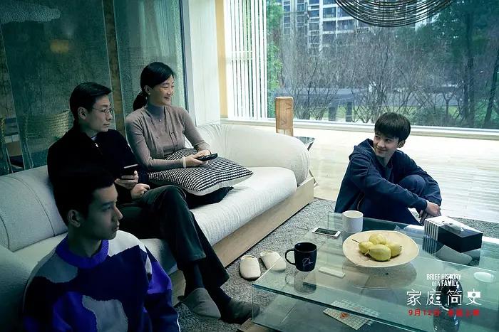《家庭简史》用极简利落的艺术风格塑造了电影的整体氛围,让一个看起来遗世独立的空间内上演多数中国家庭的普遍情境。涂伟的父亲起大早去给孩子排队报班的片段令人印象深刻,电影采用装置艺术式的做法,让家长们像模特一样定位在一串曲折的长队中,目视前方,不动声色,只有教育机构的喇叭声在空中回荡:“攻克英语,圆您和孩子的出国梦”。